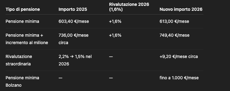 Grazie alla rivalutazione dell’1,6%, da gennaio 2026 l’importo salirà a circa 613,00 euro al mese, cioè 7.969,00 euro all’anno.
